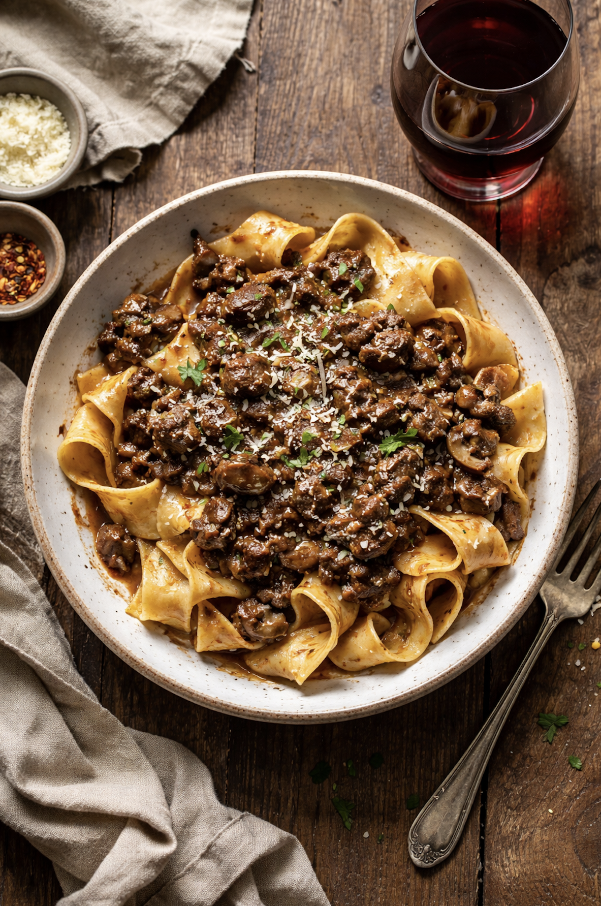 A slow-simmered winter sauce with tender beef, earthy mushrooms, and a whisper of dried fig warmth to liven up your pasta or sauteed vegetables.